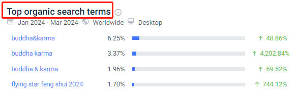Buddha&Karma, a Singaporean e-commerce, specializes in selling various spiritual accessories. Similarweb shows the site has 850K visits from January to March 2024, with organic search traffic increasing, as shown below.